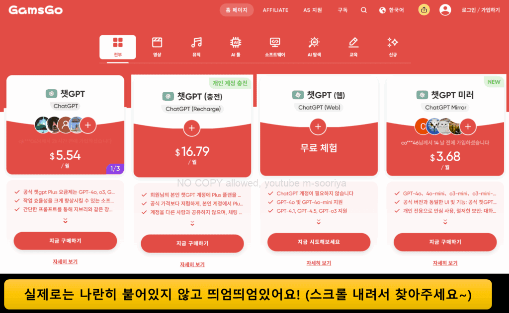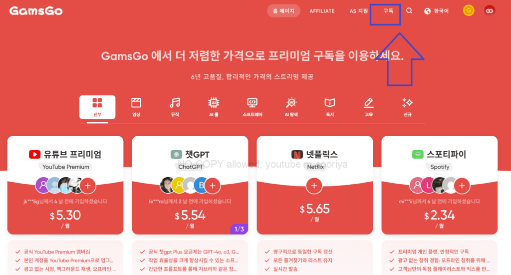 겜스고는 6년째 꾸준히 운영되고 있는 계정공유 사이트입니다. 여기서는 넷플릭스, 디즈니플러스, 유튜브 프리미엄, 챗GPT 등 다양한 프리미엄 서비스를 저렴하게 이용할 수 있습니다.