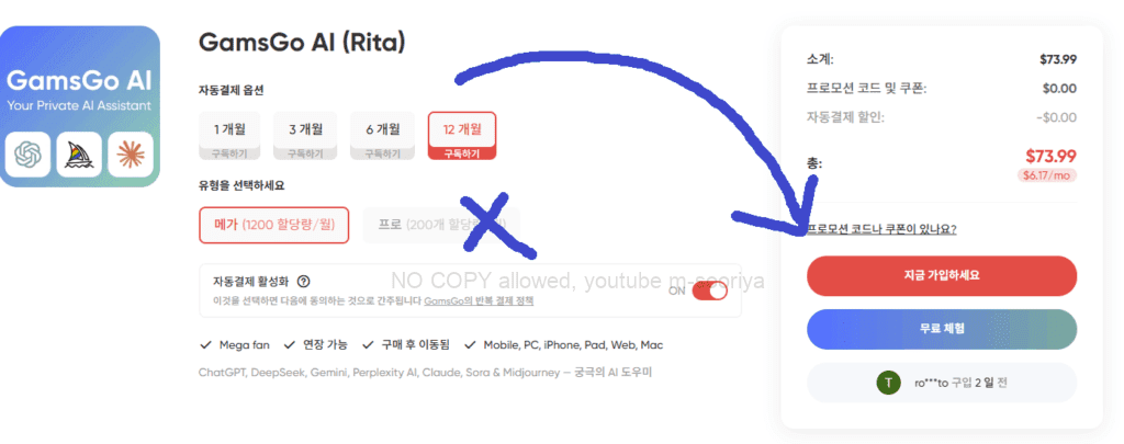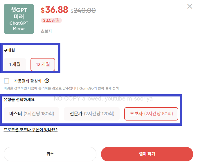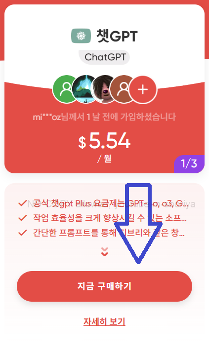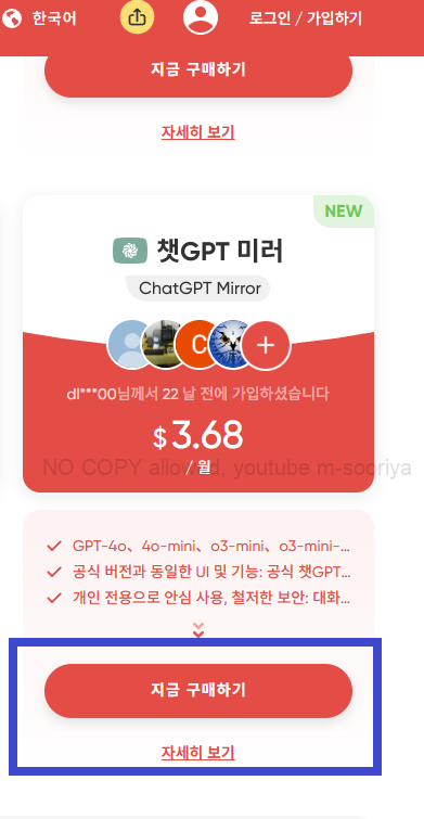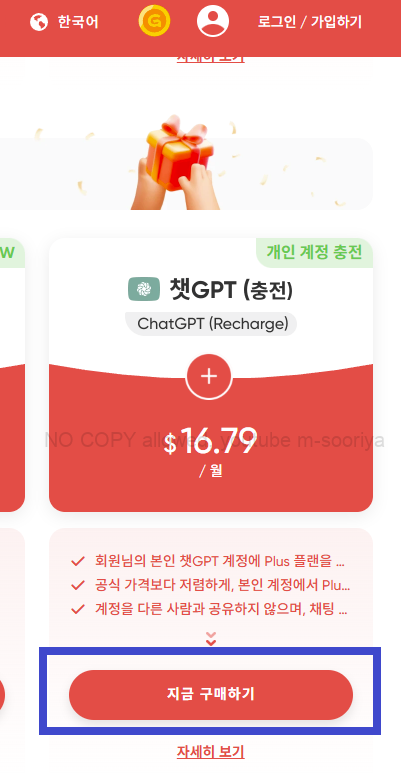 마지막으로 챗GPT (충전)에서 [지금 구매하기]를 눌러주시면 감사하겠습니다.