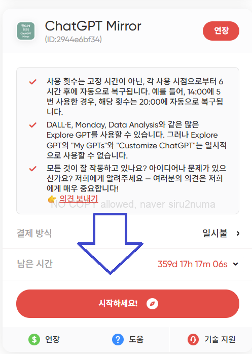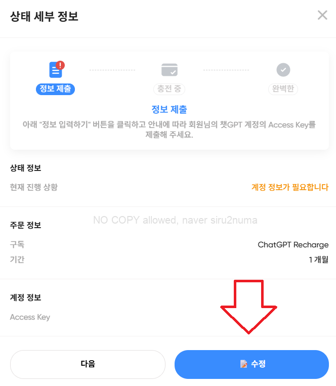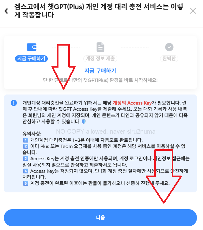 이제 [결제하기]를 누르시고 해당 설명을 확인하신 후 [다음]을 눌러주십시오.
