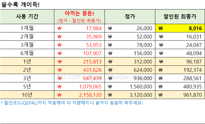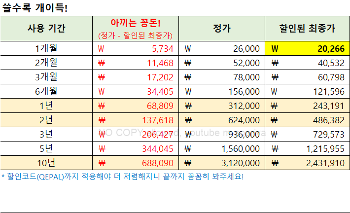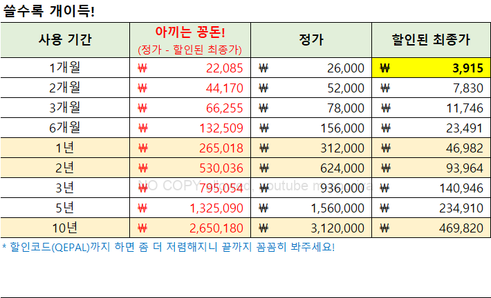 정가대비 1개월에 22,000원이나 아낄 수 있으며, 1년이면 26만원, 2년이면 53만원, 10년이면 260만원을 절약할 수 있습니다.