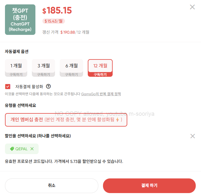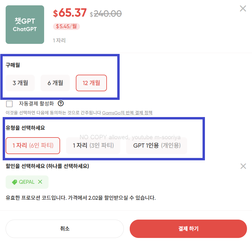 할인코드 (QEPAL) 적용과 결제 방법은 1번과 동일합니다.
