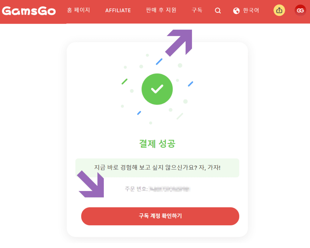 결제가 완료되면 아래 화면이 나타납니다. [구독계정 확인하기] 또는 [구독]탭을 눌러주시기 바랍니다.