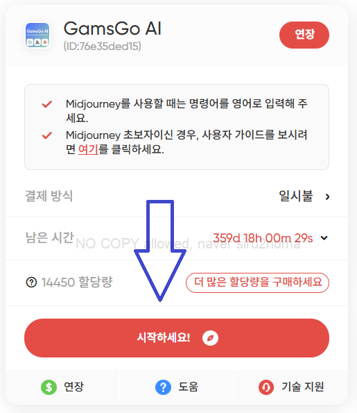 결제 후 GamsGo AI 항목에서 [시작하세요]를 눌러주시면 됩니다.