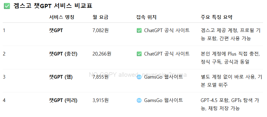 정식 계정을 그대로 유지하면서 GPT Plus로 업그레이드하고자 하신다면 ② 챗GPT (충전) — 20,266원이 적합합니다. 공식 ChatGPT 사이트를 사용하시면서도 저렴하고 간편한 옵션을 찾고 계신다면 ① 챗GPT — 7,082원을 추천드립니다. 계정 없이 웹 브라우저에서 바로 이용하고 싶으시다면 ③ 챗GPT (웹) — 7,855원이 편리합니다. 가성비를 최우선으로 하시면서 GPT‑4.5까지 활용하고 싶으시다면 ④ 챗GPT (미러) — 3,915원이 가장 좋습니다.